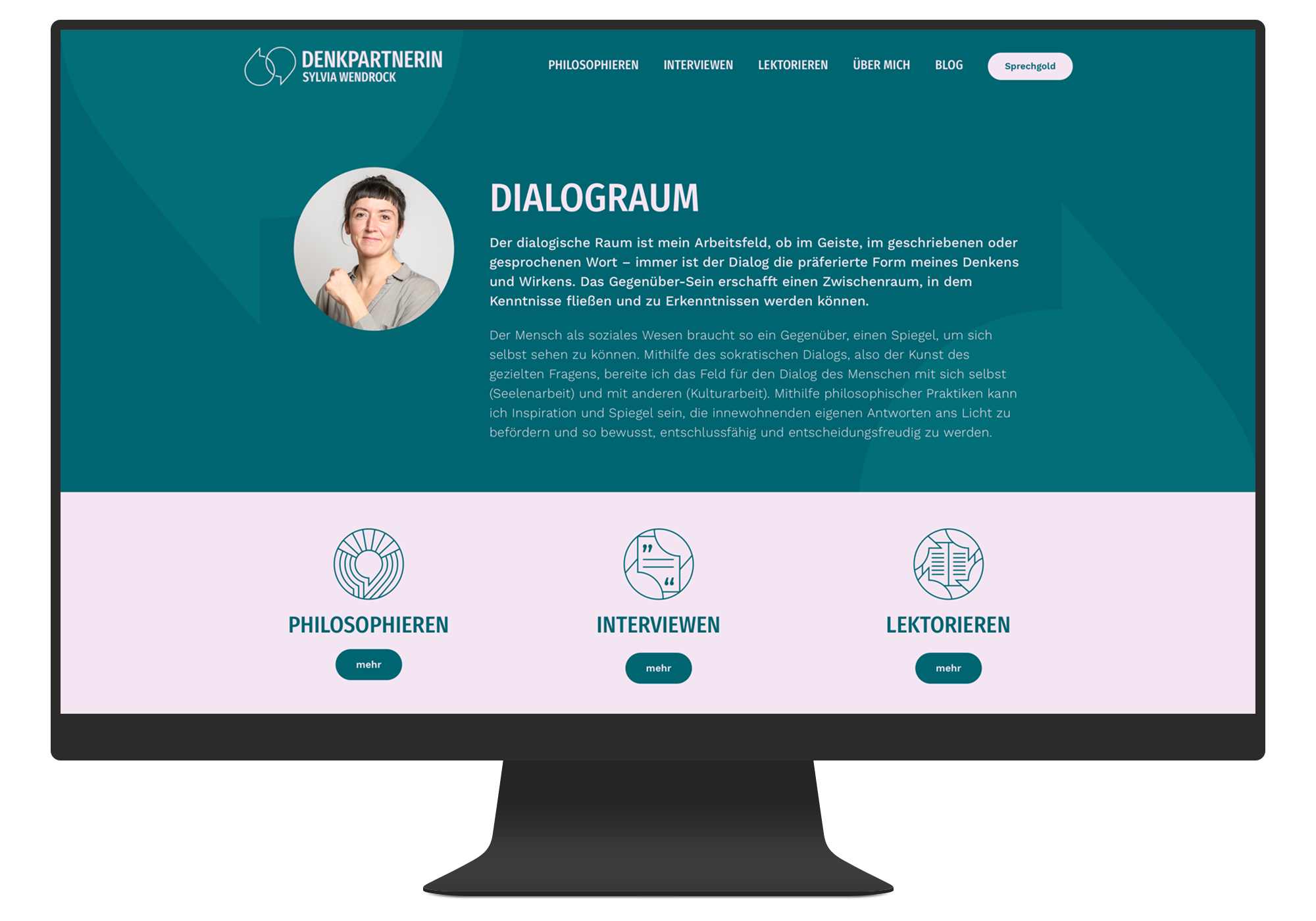 Projektbegleitung, Wegbereitung, Selbstentwicklung. Für die Denkpartnerin und Kultrice Sylvia Wendrock entstand ein visuelles Gesamtbild und eine Website. Der dialogische Raum ist ihr Arbeitsfeld, ob im Geiste, im geschriebenen oder gesprochenen Wort – immer ist der Dialog die präferierte Form ihres Denkens und Wirkens. Das Gegenüber-Sein erschafft einen Zwischenraum, in dem Kenntnisse fließen und zu Erkenntnissen werden können.