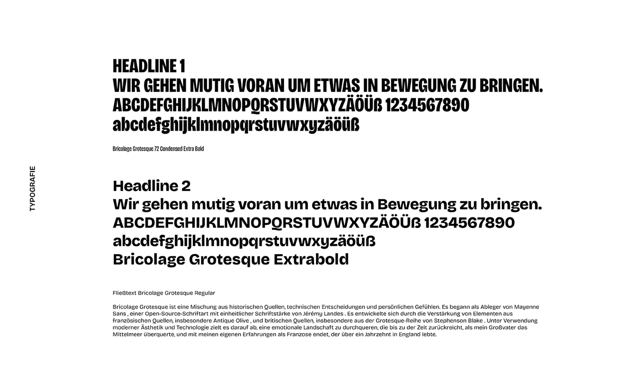 Die Farbigkeit ist offen und soll nicht zu viele klassische Assoziationen wecken. Sie soll auffallen und genau wie die Welle vielseitig einsetzbar sein. Die Typografie des Logos/Headlines dieser Variante ist kompakt und stark. Es soll eine Dringlichkeit zum Ausdruck gebracht werden. Der Font Bricolage Grotesque ist durch seine Vielfältigkeit sehr gut für ein Corporate Design geeignet und bringt neue und alte Formen zusammen zu einem zeitgemäßen Font.